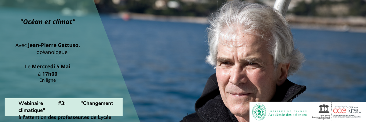 Ce troisième webinaire aura lieu le mercredi 5 mai prochain à 17h et aura pour thème Océan et Climat. Il sera assuré par l’océanologue M. Jean-Pierre Gattuso, directeur de recherche au CNRS au laboratoire d’océanographie de Villefranche (Sorbonne Université) et contributeur à plusieurs rapports du GIEC.
